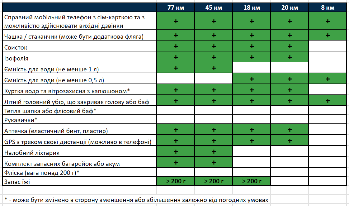 Список обов’язкового спорядження може бути змінений в сторону його зменшення за сприятливих погодних умов. Остаточний список спорядження буде опубліковано 25 липня на сайті ВсіПробіги та в соцмережах Твоя Пригода. У разі відсутності, на фініші або будь-якому КП, обов’язкового спорядження учасник отримує штраф в розмірі 30 хвилин.